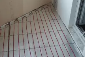 На данный момент технология теплого пола обеспечивает не только высочайший уровень термоизоляции, но и дает возможность регулировать температуру внутри помещения. Конструкционно теплый пол — это инфракрасная плёнка (подогрев напольного покрытия осуществляется с помощью инфракрасных лучей) или элемент с нагревательным кабелем. Тёплый пол работает от электричества, а температура увеличивается/опускается с помощью терморегулятора. Тёплый пол можно сделать на любом балконе, данным видом утепления можно подтапливать балкон при средних зимних температурах, если не закрывать двери балкона.
